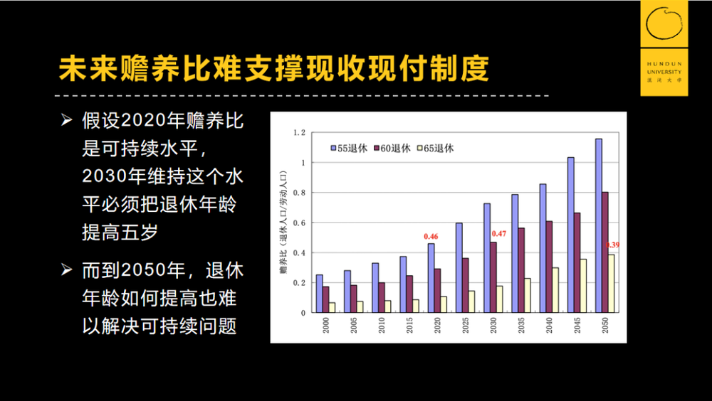 2020年,我们的退休人员和劳动人口比是0.46,假设这是可持续的,那未来要保持这个比例,比如到了10年后的2030年,就必须把退休年龄提高5岁。再往后到了2050年的时候,尽管提高到65岁退休,提高了10岁,但还是不能保证0.46这个赡养比。