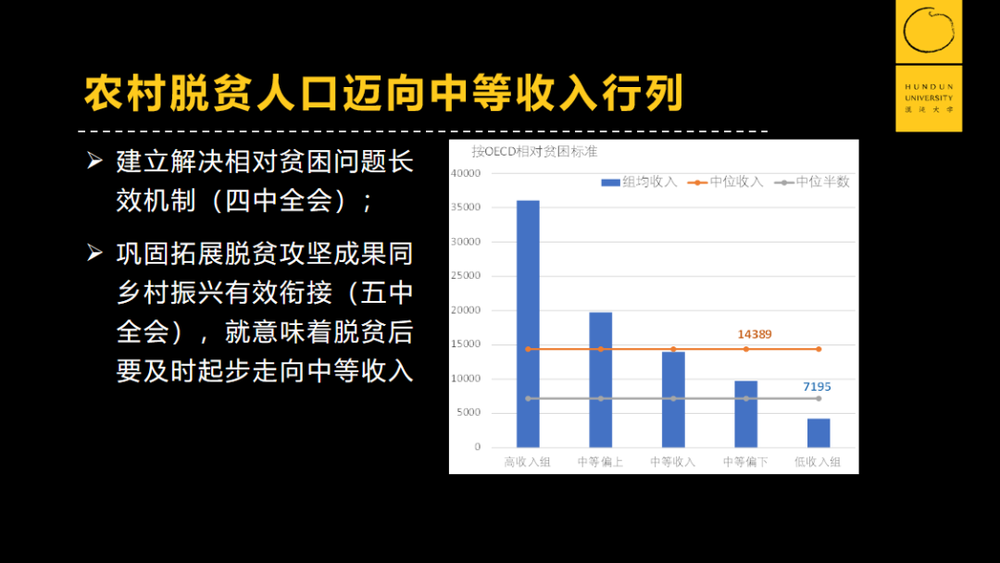 什么叫绝对贫困?就是人能够“两不愁三保障”(“两不愁”是稳定实现农村贫困人口不愁吃、不愁穿;“三保障”就是保障其义务教育、基本医疗和住房安全)。如果确定一个绝对标准,比如世界银行的标准是1.9美元一天,中国的标准要比这个高。还有一个相对标准,我们以OECD国家确定的相对贫困标准为例,他们认为社会的中位收入即正好在中间的那个收入水平的50%,就是相对贫困线,如果你的收入还没有达到中位收入的50%水平,你就处在相对贫困状态。