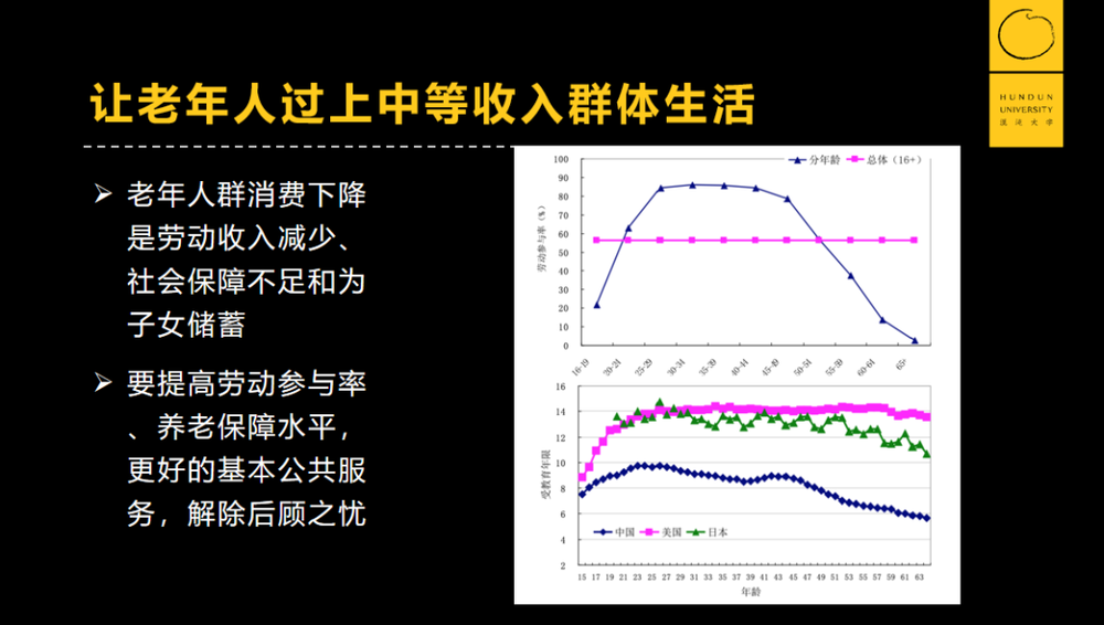 劳动参与率、受教育程度是制约老年人就业的因素,因此让老年人成为中等收入群体的根本,一是提高劳动参与率,要创造好的条件,消除技术鸿沟,提供更好的培训等;二是要提供更好的社会保障,使老年人的生活水平不断提高,不让他们有后顾之忧,还要保障好他们的子女,如果整个社会的社会保障不好,老年人不仅要帮着孩子解决问题,还要帮助孩子的下一代解决诸如住房问题,他们的消费意愿就不可能提高。