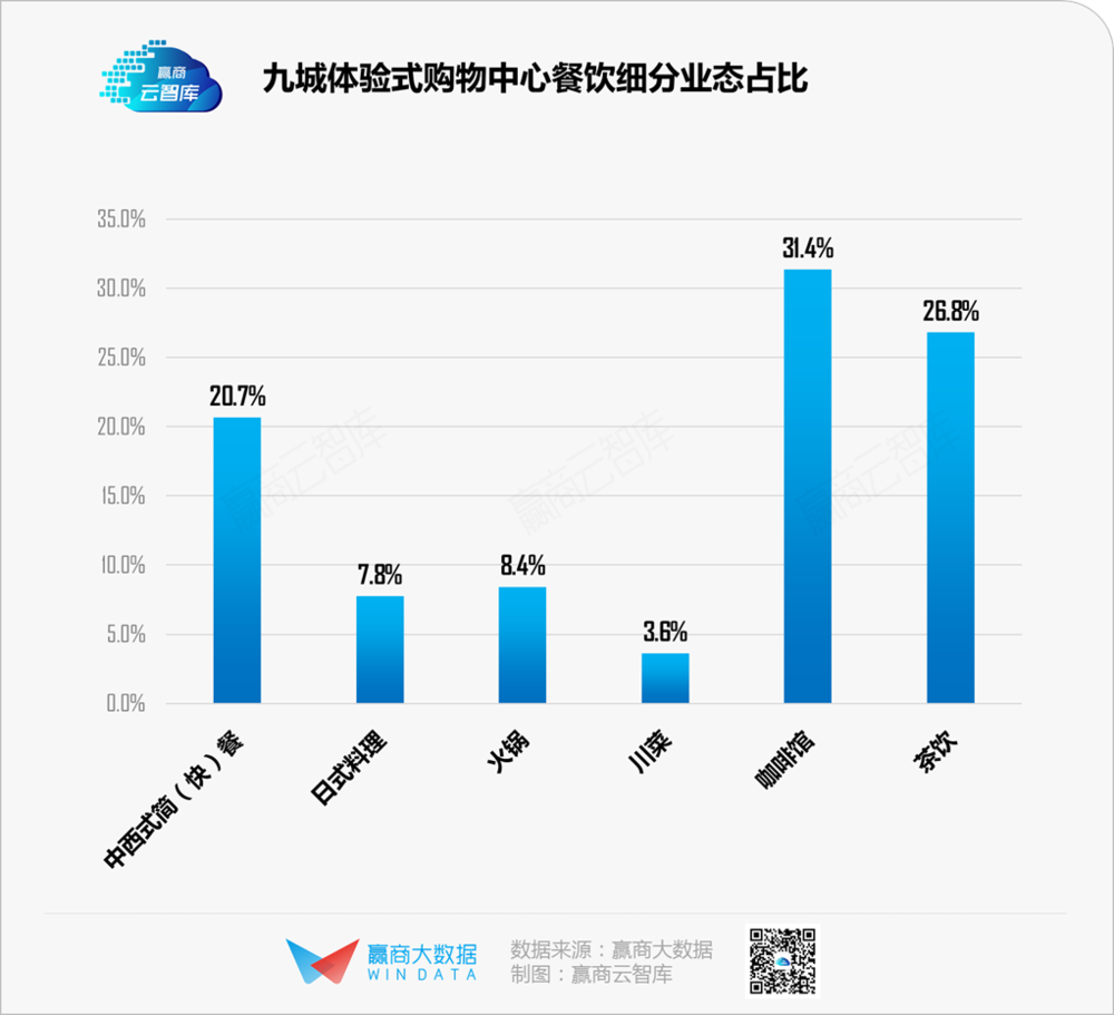 据赢商大数据监测,9座城市、254个(截至2020年9月30日)购物中心体验业态占比平均达42.6%。