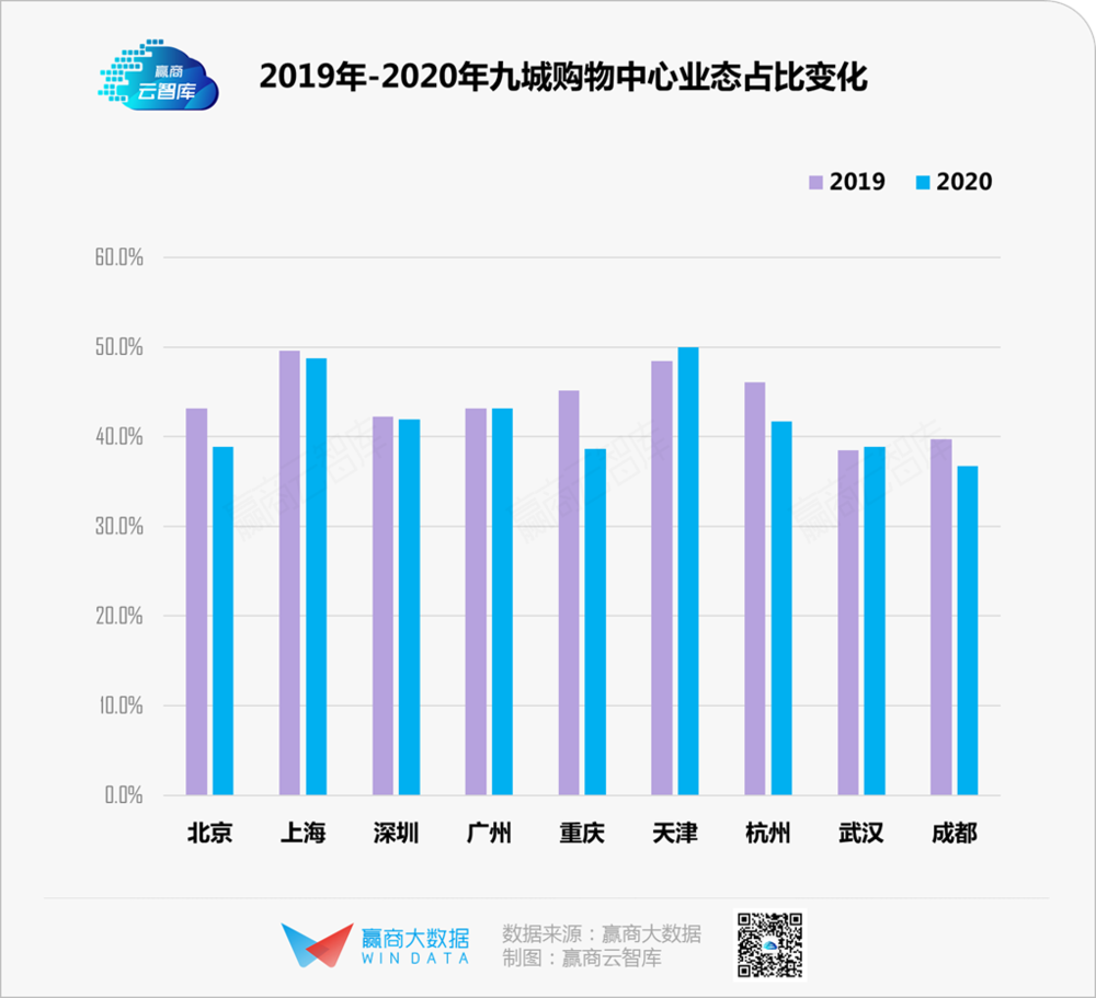 当然,这种洗牌在2020年的疫情之下,呈现出了一种特定状态。据赢商大数据监测,相较2019年,去年9大样本城市目标购物中心体验业态占比并未出现断崖式下跌。