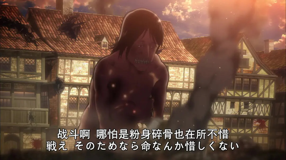 在此可窥见谏山创在《进击的巨人》中所展现出的哲学思想,前期在人类与巨人的对抗中,无数的牺牲和毁灭向观众传递着人类的无力感,即世界是残酷的,死亡是不可避免的,民众对其的态度是消极麻木的。