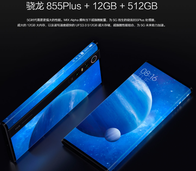 2019 年 9 月,小米对外展示了小米 MIX Alpha 5G 概念手机,该手机突破了常人对智能手机的预设,几乎机身周围全是屏幕,官方称屏占比达到 180.6%,俗称“环幕屏”。小米在发布会中还为该产品公布了 19999 元的定价,并计划同年 12 月份开售。