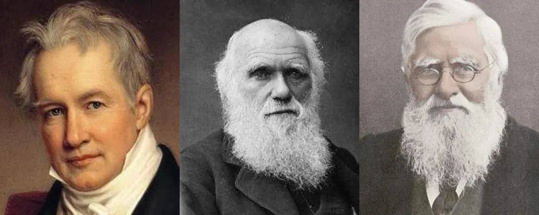 从左到右分别为亚历山大•冯•洪堡、达尔文、华莱士。