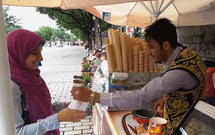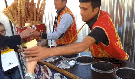 在世界上所有的冰激凌里,好像只有土耳其冰激凌配得上这样一场演出。因为只有土耳其冰激凌拥有了演出所必备的性质——它是世界上最粘的冰激凌。