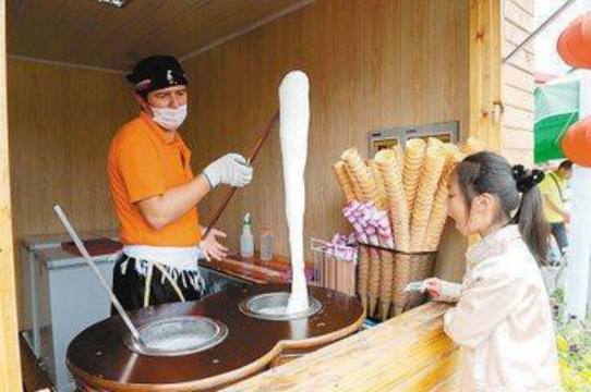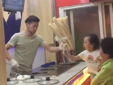 技艺更加精湛的冰激凌艺人则会顺势调戏一下可爱的顾客,利用冰激凌对顾客的肢体发出突袭,再全身而退,这一招对技巧和熟练度都有着不低的要求。