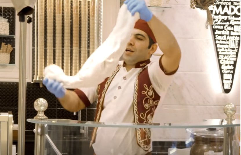 就正如前面看到的冰激凌表演一样,用一个冰激凌小勺即可将整桶冰激凌从冰柜中提起在空中甩动,粘性十足的土耳其冰激凌也能够像麦芽糖一般,拉出一条长长的冰激凌瀑布。