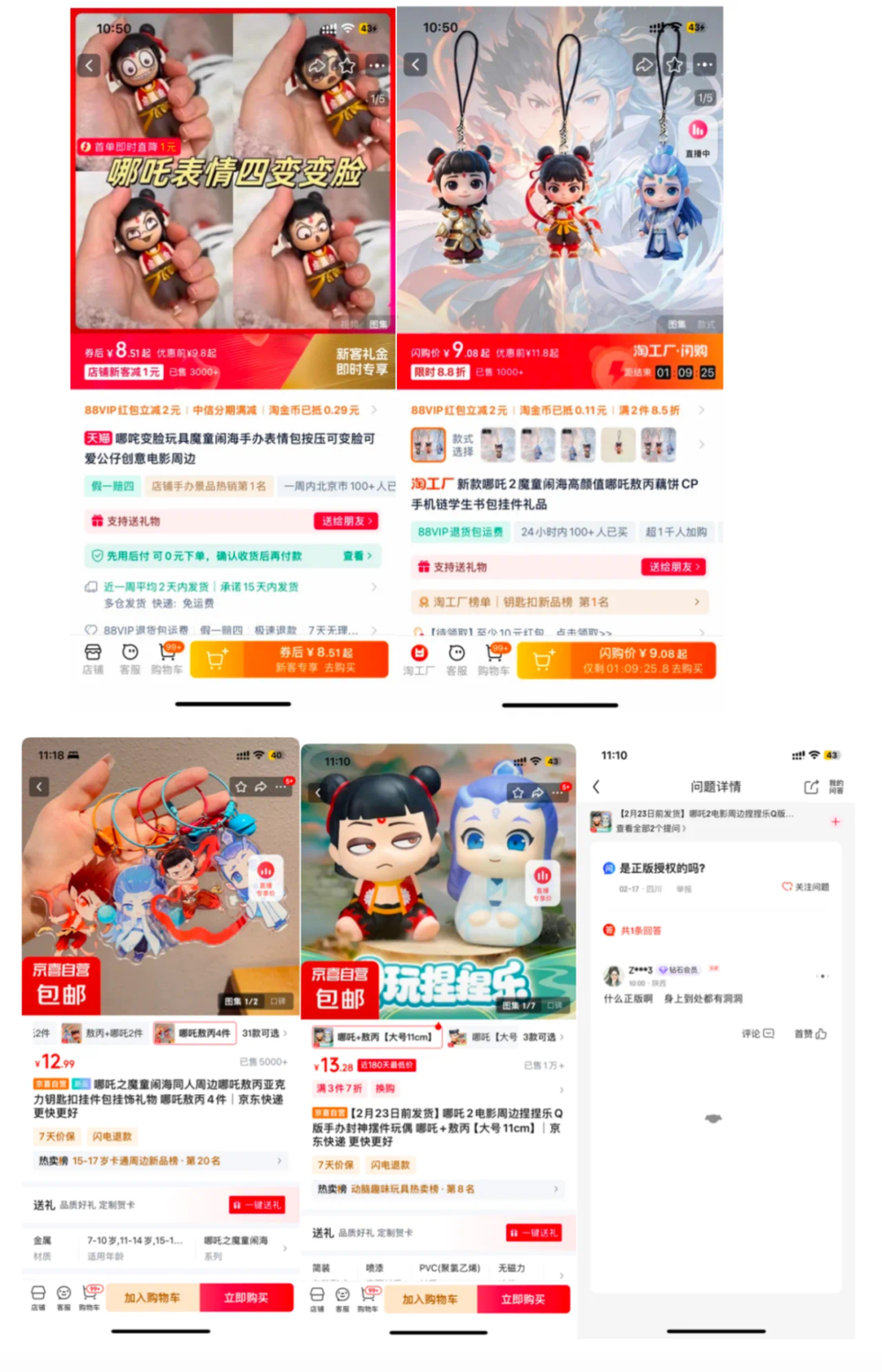 (图注:淘宝、京东等电商平台均有未经授权的《哪吒2》周边售卖。)