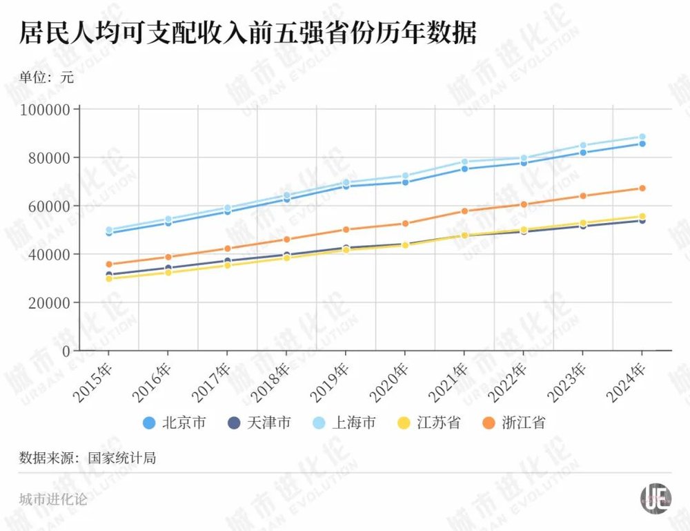 国家统计局公布的数据显示,全国31省份中,上海、北京、浙江、江苏、天津的居民人均可支配收入稳居全国前五强。其中,2024年上海居民人均可支配收入88366元,位列第一;同处“8万元”梯队的北京为85415元。