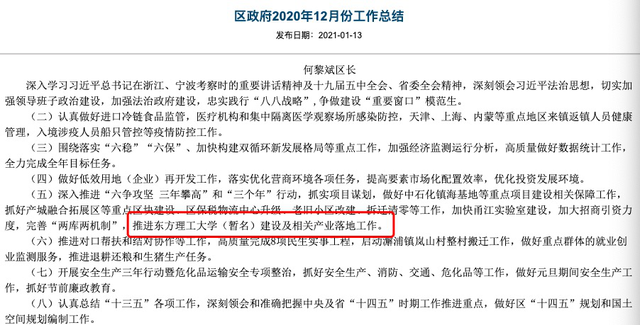 1月13日,宁波镇海区政府官网公布《区政府2020年12月份工作总结》,该公告披露:推进东方理工大学(暂名)建设及相关产业落地工作。