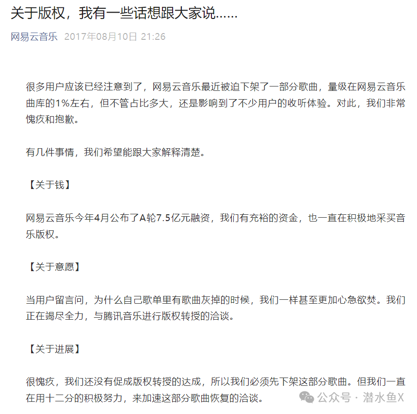 再自由的市场也需要防止垄断现象的出现,这一点在音乐流媒体1.0时代就已经发生过了。由于TME对众多版权垄断,emo的网易云不得不发表《关于版权,我有一些话想跟大家说》来陈述版权困境。以至于2018年在国家版权局出手协调,才让TME与网易云音乐方面达成了99%的曲库版权互相授权。