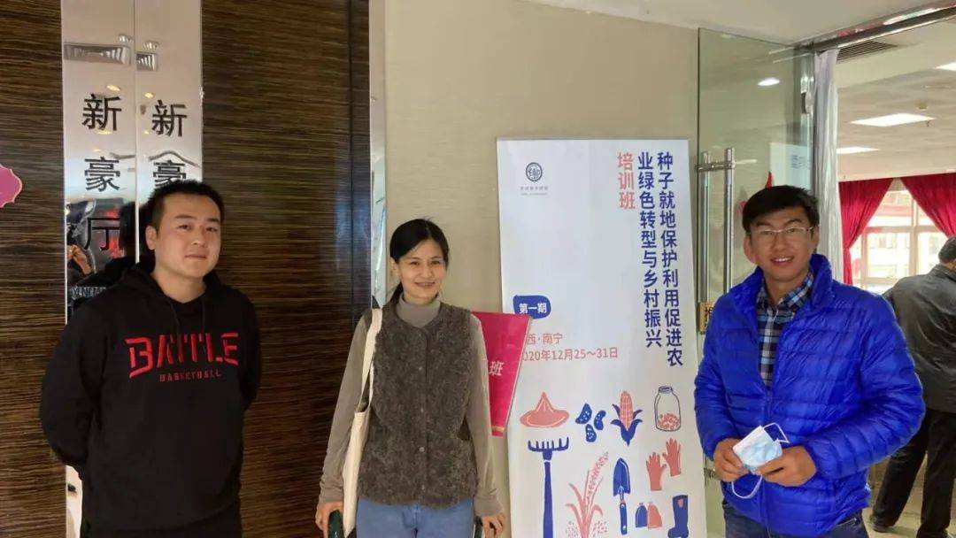 2020年12月,秀才与食通社的项目官员马小超(左二)以及北京有机农夫市集的生态农友陈子彧(左一)一起参加农民种子网络的培训。图源:马小超