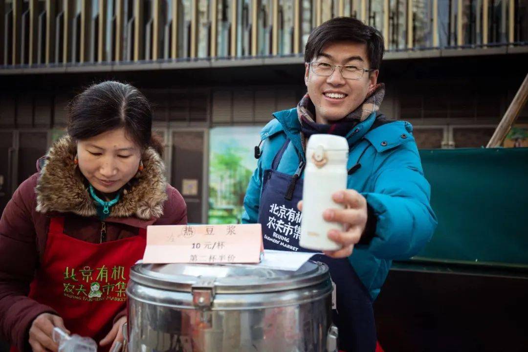 秀才和妻子在市集上卖豆制品,老顾客会自带保温杯来打豆浆。图源:北京有机农夫市集
