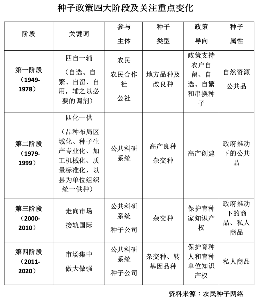 有专家把新中国的种子政策分为四大阶段(见下图)。我父亲在一线亲历了第二和第三阶段,而我,也见证了最新的阶段。希望我们父子的经历能让大家管中窥豹,理解种子政策背后,农民、政府、企业究竟是如何参与到种子产业中来的。