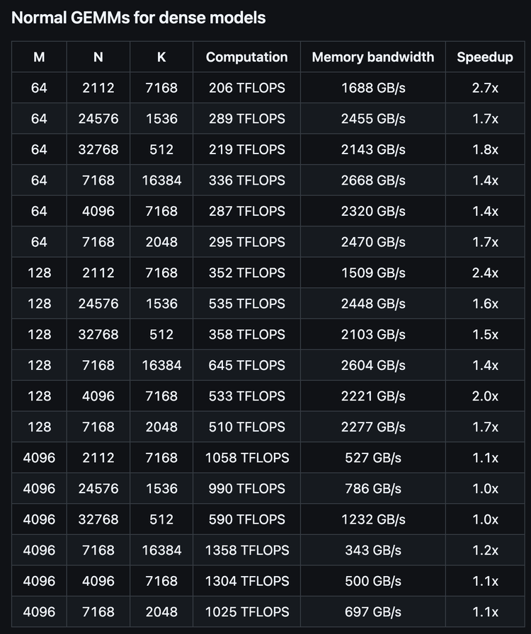 在小批量(M=64或128)的情况下,DeepGEMM性能表现尤为出色,加速比高达2.7倍。这类似于在短跑比赛中,DeepGEMM展现出了显著的速度优势。这对于AI模型的实时推理(如聊天机器人生成回复)特别有价值。
