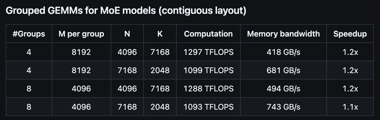 对于混合专家模型(MoE)的计算,DeepGEMM提供了约1.2倍的稳定性能提升。这种稳定的性能提升对于模型的整体效率非常重要。