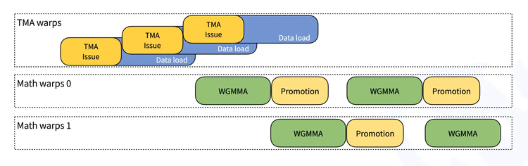 DeepGEMM的内核采用了CUTLASS设计中的线程束专用架构,这使得数据移动、张量核心MMA指令和CUDA核心提升可以重叠执行。下图简单展示了这个过程: