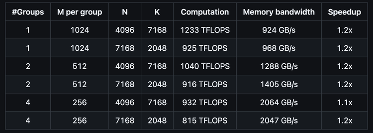 在处理大批量数据时,DeepGEMM同样保持了约1.1-1.2倍的性能优势。这对于批量处理大量文本或图像非常有用,就像工厂的流水线能够更快速地处理大量产品一样。