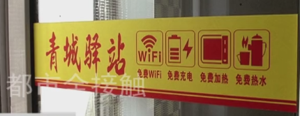 在青城驿站的玻璃防撞条上,有它的基础功能介绍:免费wifi,免费充电,免费微波加热,免费热水。
