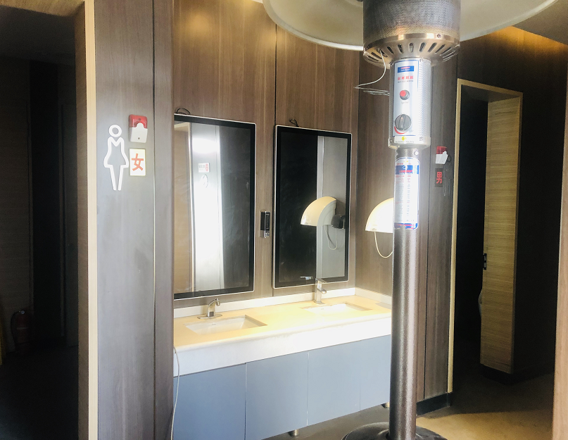 厕所里,水龙头里流出的是温水,新风除臭系统、空气质量监测系统、生物识别自动供纸系统装备齐全,门口还站着两个戴“青城驿站”工牌的保洁人员。