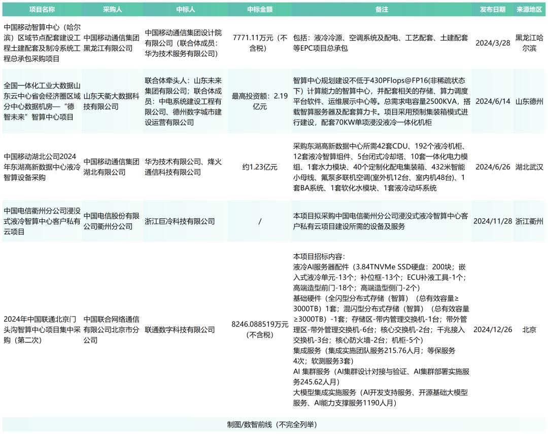 2024年的中标项目中,也有不少涉及对液冷设备的招标采购。如“中国移动湖北公司2024年东湖高新数据中心液冷智算设备采购”项目,中标金额约1.23亿元。
