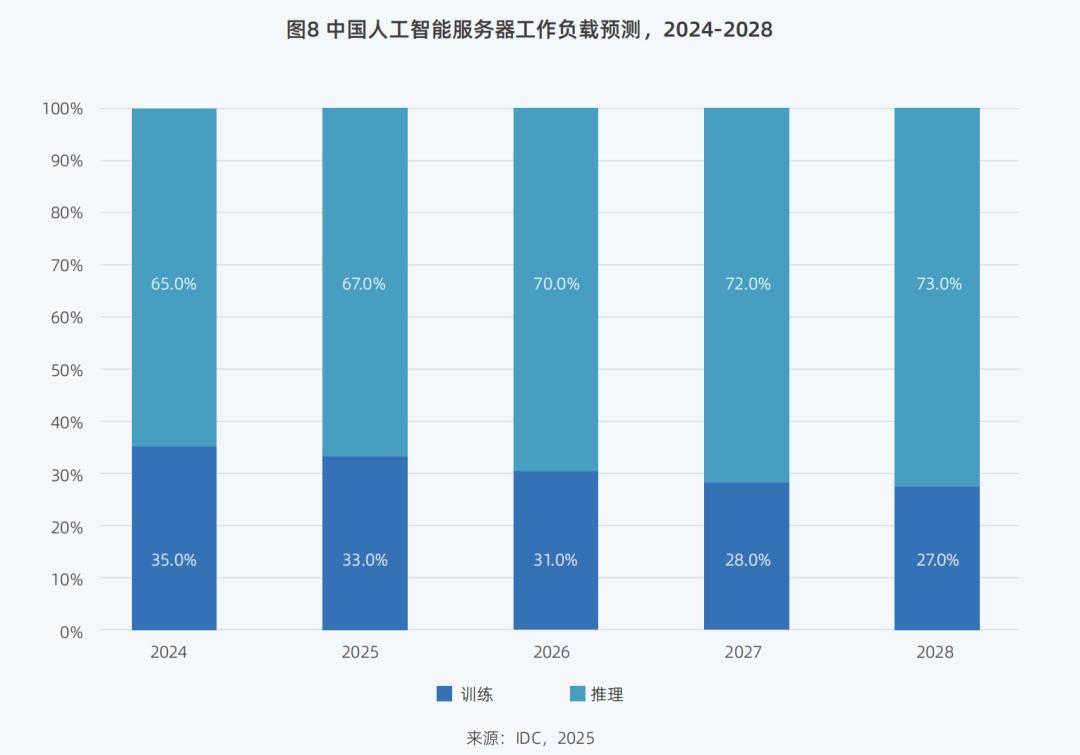 市场分析机构IDC和智算Infra大厂浪潮信息联合发布的《2025年中国人工智能计算力发展评估报告》也显示,推理算力有望迎来大爆发,2025年推理的工作负载占比将达到67%,并在2028年进一步提升至73%。