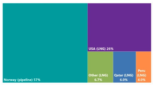 2023年,英国57%的天然气进口通过海底天然气管道来自挪威,其余部分来自美国(26%)、卡塔尔(6%),以及其他来自非洲和拉丁美洲的国家。