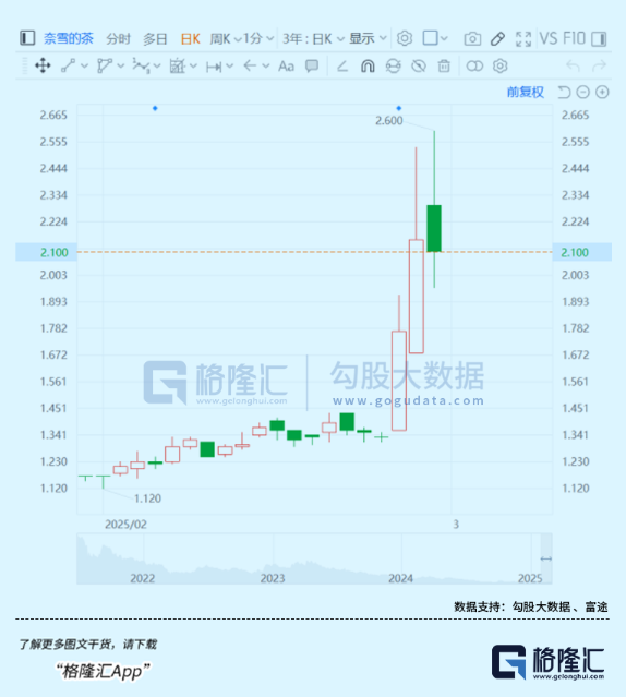 而在蜜雪冰城的带动之下,奈雪股价接连几日暴涨,盘中一度涨至2.6港元,创近2024年5月以来新高,茶百道、古茗股价也多日上涨。
