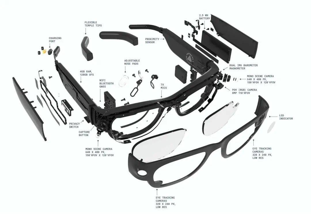 最明显的变化在传感器系统上,一代机采用的是最基础的环境感知元件,只有摄像头和惯性传感器,Aria Gen 2在此基础上,增加了许多新的配件,包括RGB摄像头、6DOF SLAM摄像头、眼动追踪摄像头、空间麦克风、IMU、气压计、磁力计和GNSS。