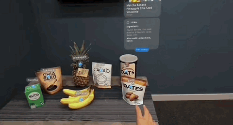 镜框周围的7个摄像头和传感器,让Meta Orion真正实现了将虚拟投入现实,并将其融入现实的能力。它能将全息图像精准悬停在半空中,也能识别眼前的物品,例如通过桌面上的食材,它就能给你定制一份食谱。