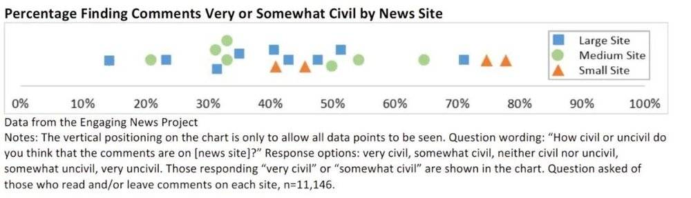 新闻媒体机构的规模和评论区文明程度的关系。图片来源:德克萨斯州大学奥斯汀分校媒介参与研究中心