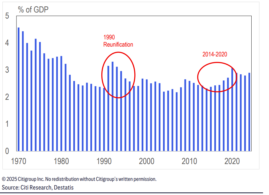 不过,美银表示,尽管存在这些限制因素,德国的财政赤字可能在2027年前持续接近GDP的3%,这一风险正在上升。
