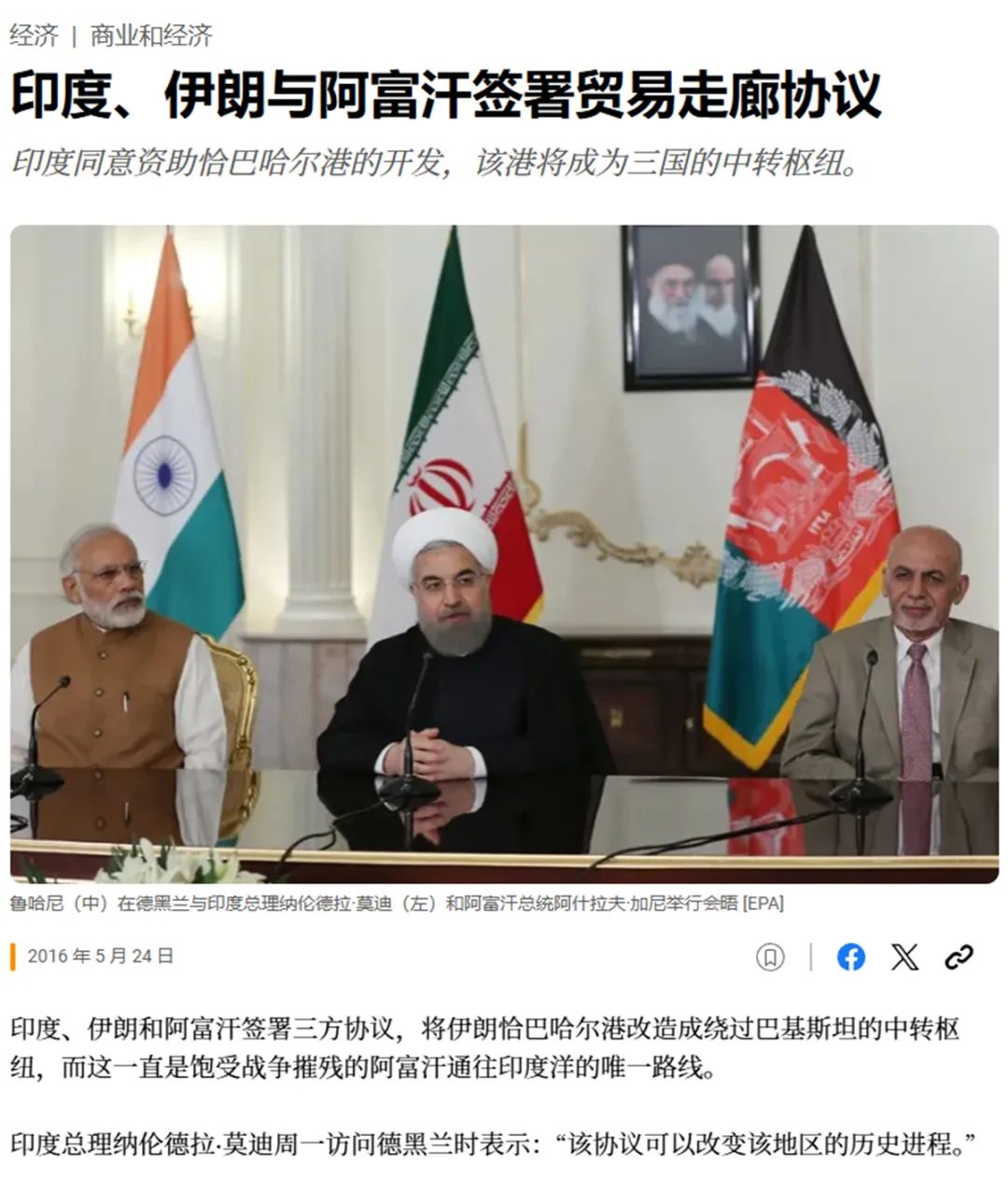 与此同时,恰巴哈尔港十分靠近巴基斯坦与阿富汗,这还为伊朗吸引来了巴基斯坦的死对头——印度的投资。2013年,伊朗和印度签署了开发恰巴哈尔港的协议。截至2016年,印度已承诺投资20亿美元,通过建设铁路将恰巴哈尔港与阿富汗及中亚连接起来。