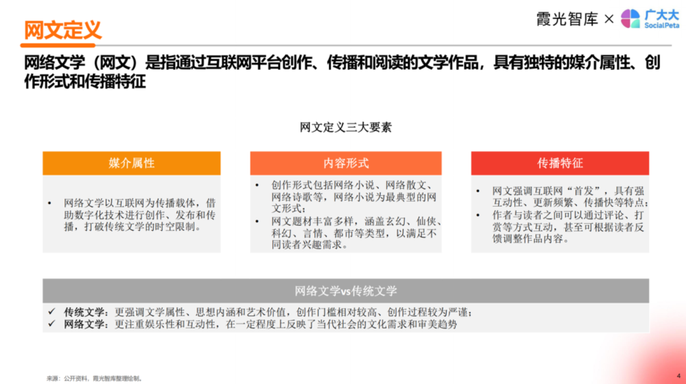 网络文学(网文)是指通过互联网平台创作、传播和阅读的文学作品,具有独特的媒介属性、创作形式和传播特征。不同于传统文学更强调文学属性、思想内涵和艺术价值, 网络文学更注重娱乐性和互动性,在一定程度上反映了当代社会的文化需求和审美趋势。