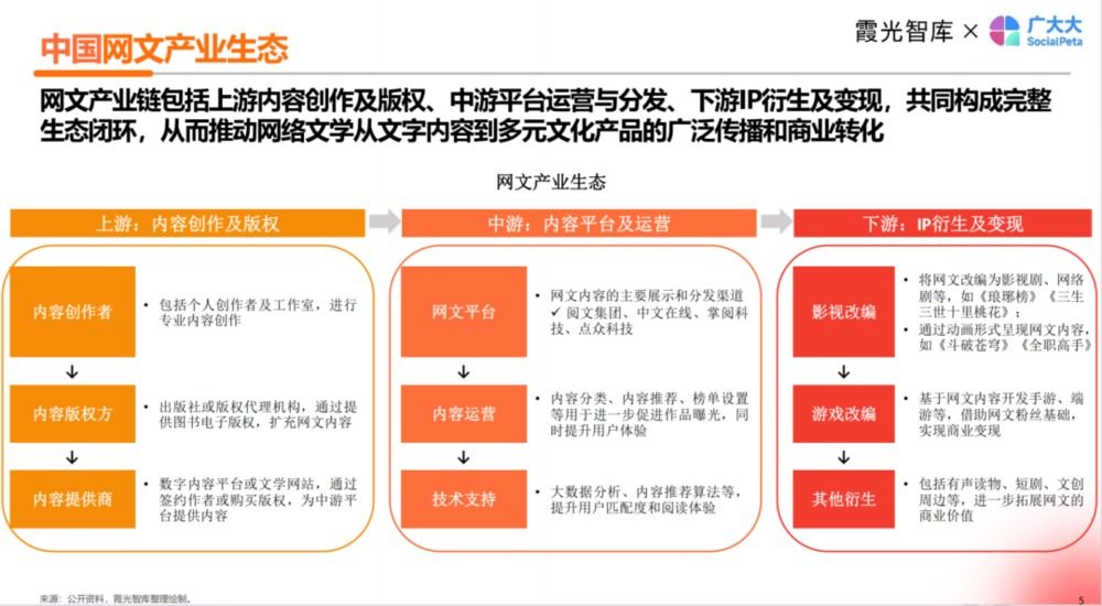 网文产业链包括上游内容创作及版权、中游内容平台运营与分发、下游IP衍生及变现,共同构成完整生态闭环,从而推动网络文学从文字内容到多元文化产品的广泛传播和商业转化。