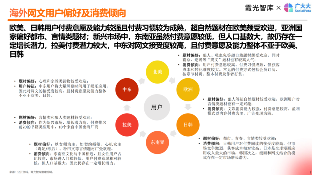 欧美、日韩用户付费意愿及能力较强且付费习惯较为成熟,超自然题材在欧美颇受欢迎;亚洲国家偏好都市、言情类题材。新兴市场中,东南亚虽然付费意愿较低,但人口基数大,因此仍存在一定增长潜力;拉美整体付费潜力较大;中东对网文接受度较高,且付费意愿及能力整体不亚于欧美、日韩。