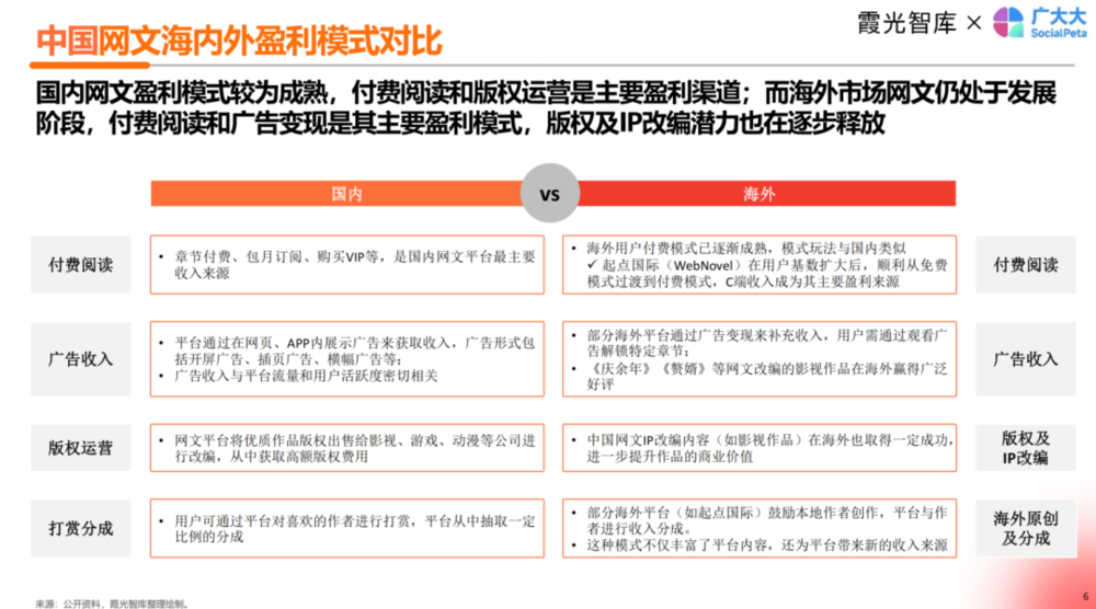 国内网文盈利模式较为成熟,付费阅读和版权运营为主要盈利渠道,而海外市场网文仍处于发展阶段,付费阅读和广告变现则为其主要盈利模式,版权及IP改编潜力也在进一步释放。