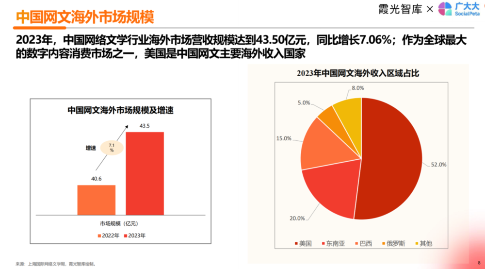 2023年,中国网络文学行业海外市场营收规模达到43.50亿元,同比增长7.06%。作为全球最大的数字内容消费市场之一,美国是中国网文主要海外收入国家。