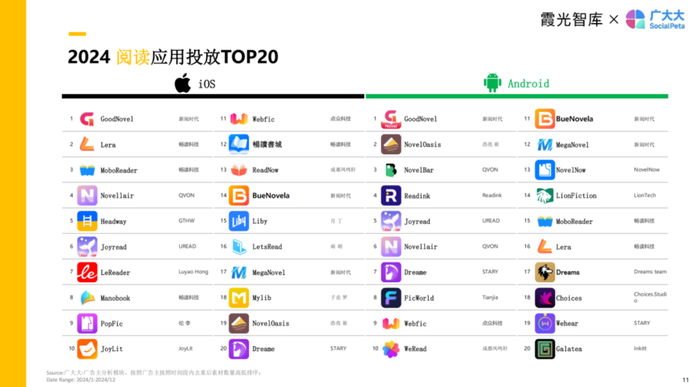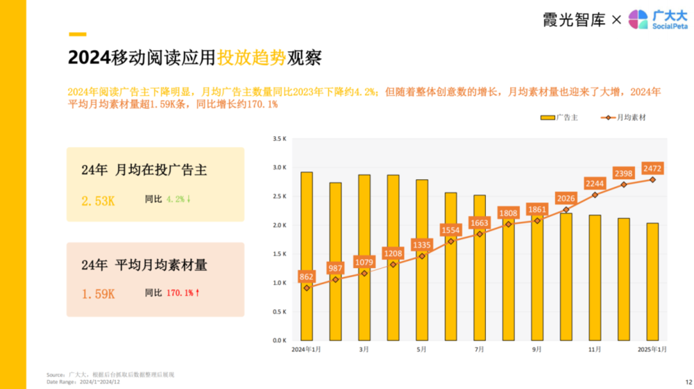 2024年阅读广告主下降明显,月均广告主数量同比2023年下降约4.2%;但随着整体创意数的增长,月均素材量也迎来了激增,2024年平均月均素材量超1.59K条,同比增长约170.1%。