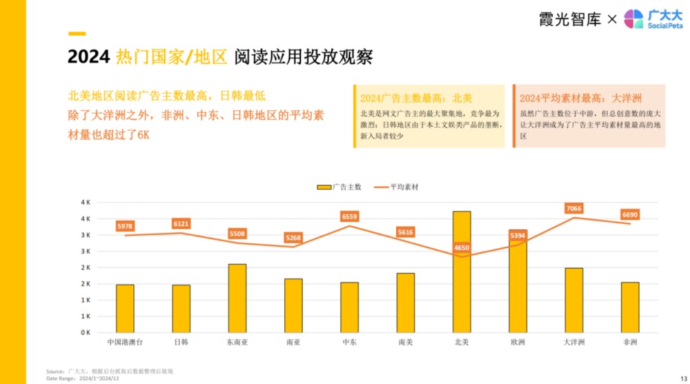 北美地区阅读广告主数量最高,日韩最低。除大洋洲外,日韩、中东、非洲地区的平均素材量也超过了6K。