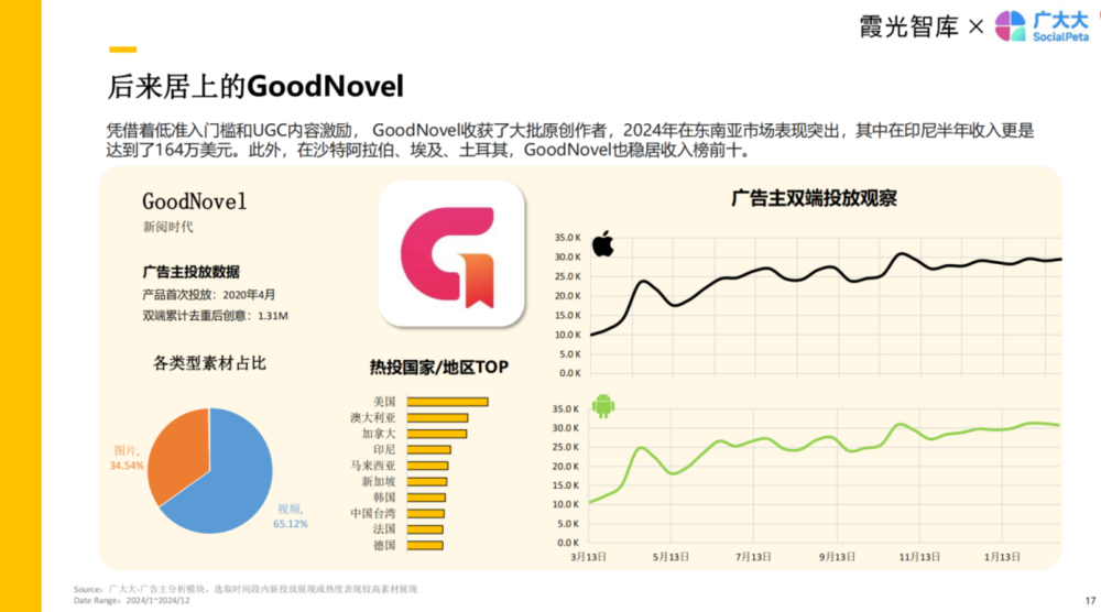 凭借低准入门槛和UGC内容激励, GoodNovel收获了大批原创作者,2024年在东南亚市场表现突出,其中在印尼半年收入更是达到了164万美元。此外,在沙特阿拉伯、埃及、土耳其,GoodNovel也稳居收入榜前十。
