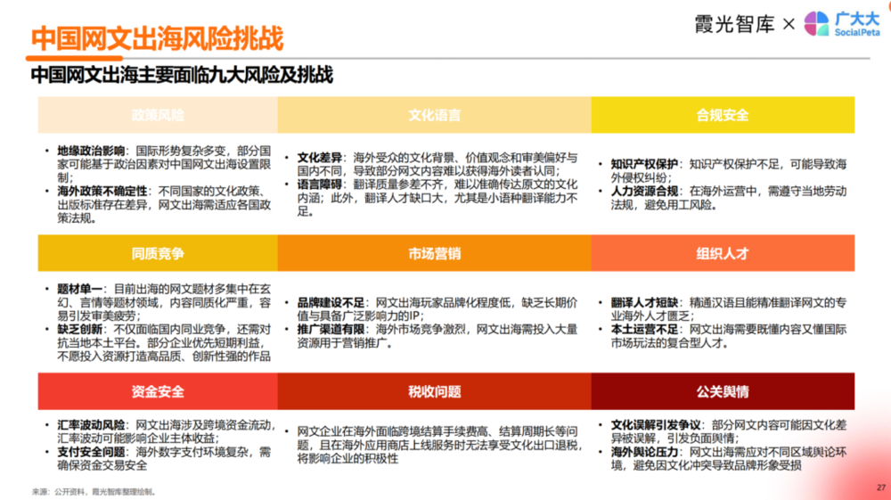 中国网文出海主要面临地缘政治、文化语言、合规安全、同质竞争、市场营销、组织人才、资金安全、税收问题、公关舆情这九大风险及挑战。