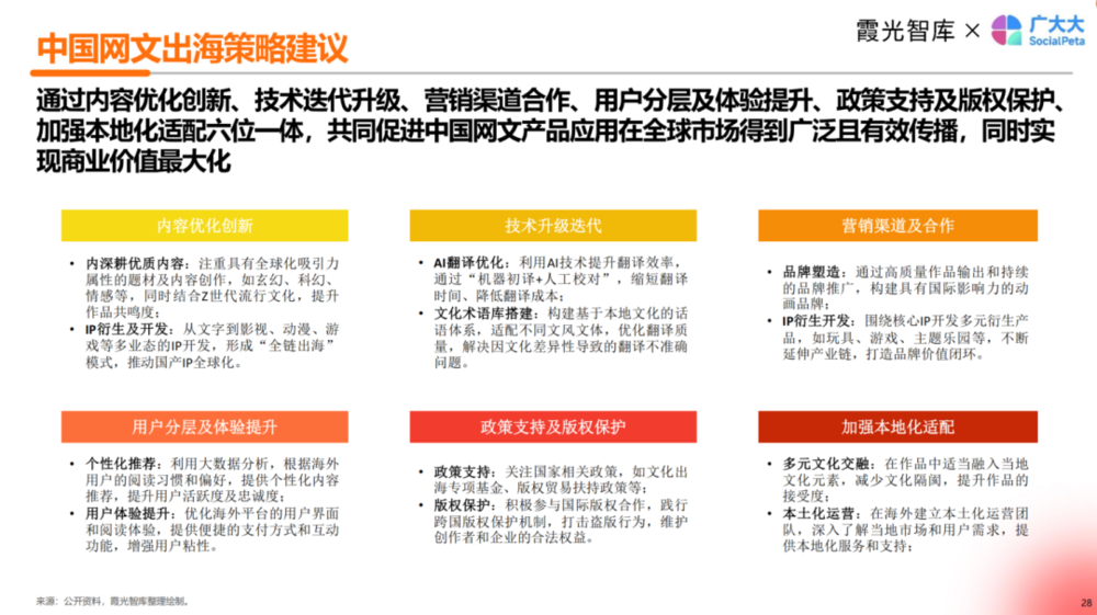 若通过内容优化创新、技术迭代升级、营销渠道合作、用户分层及体验提升、政策支持及版权保护、本地化适配六位一体,将共同促进中国网文产品应用在全球市场得到广泛且有效传播,实现商业价值最大化。