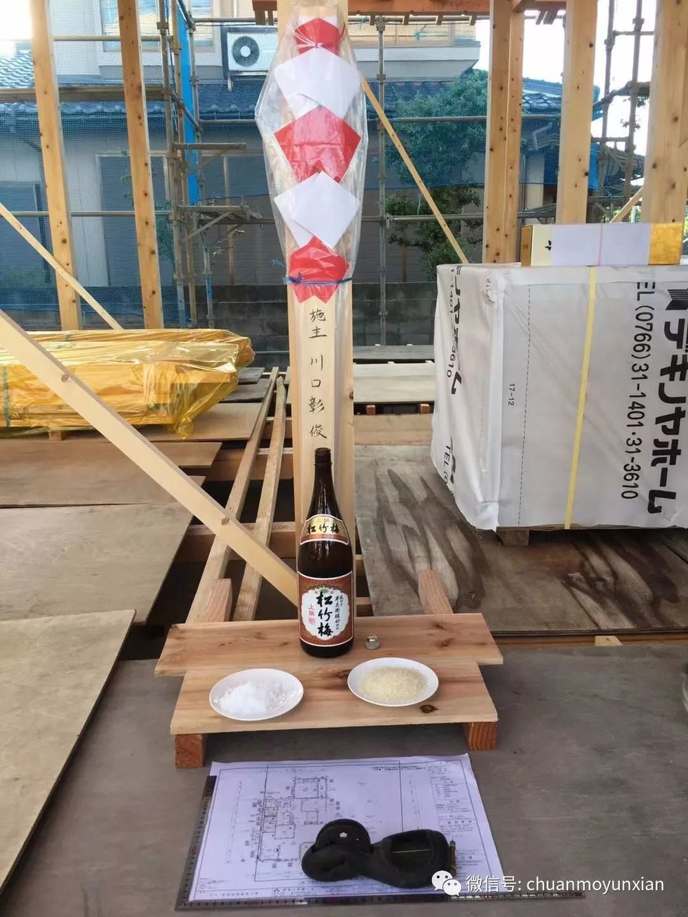立主柱的典礼“上栋式”是傍晚举行的,在神位前摆出设计图、墨斗、曲尺。把大米、盐和清酒奉献给保护神。