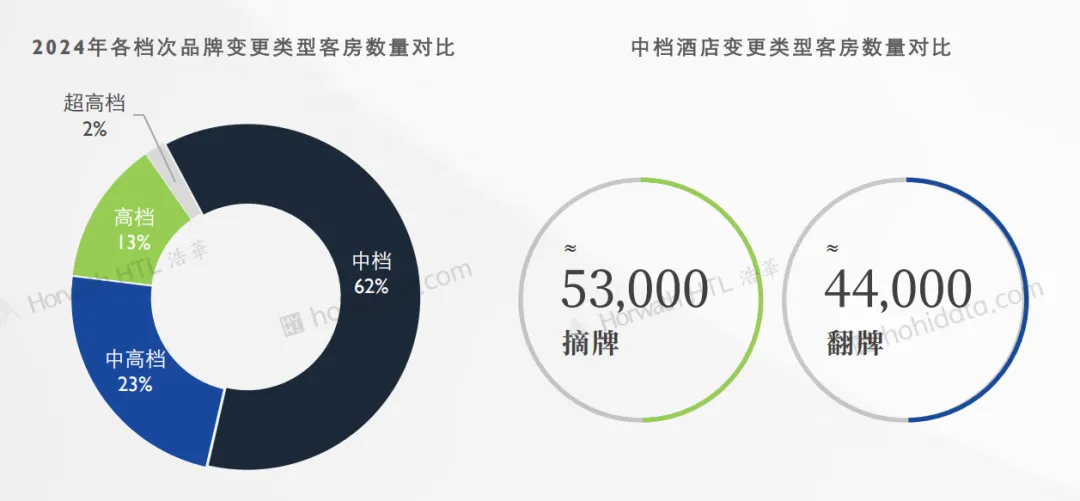 因为在2024年,1186家中档酒店经历品牌变更,占品牌变更客房总量的61%。在这其中,又有689家中档酒店直接摘牌。