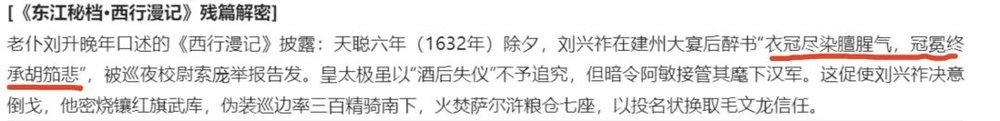 在真实的历史中,刘兴祚1630年就已经去世了。但在deepseek的笔下,降将刘兴祚直接原地复活,并于1632年在皇太极眼皮底下,写出了“衣冠尽染腥膻气,冠冕终承胡笳悲”这样颇有忠义气节的诗歌。