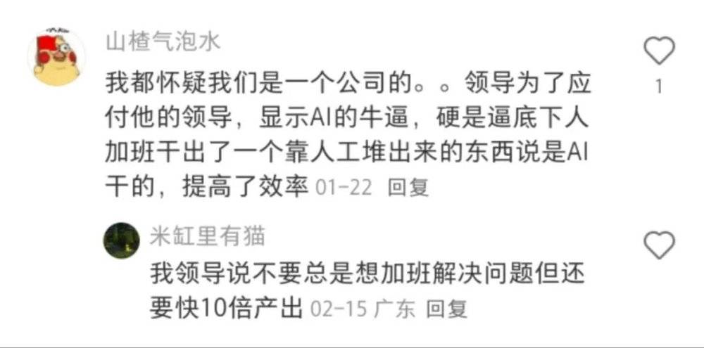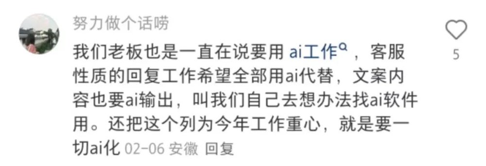 有位网友表示“我们老板也是一直在说要用AI工作,客服性质的回复工作希望全部用AI代替,文案内容也要AI输出,叫我们自己去想办法找AI软件用,还把这个列为今年工作重心,就是要一切AI化。”