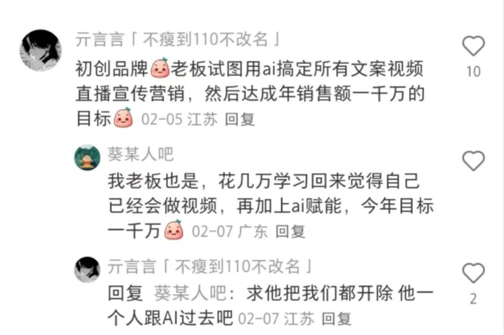 喜感的是,在这条评论底下,另一个网友表示:“我们老板也是,花几万学习回来觉得自己已经会做视频,再加上AI赋能,今年目标一千万。”