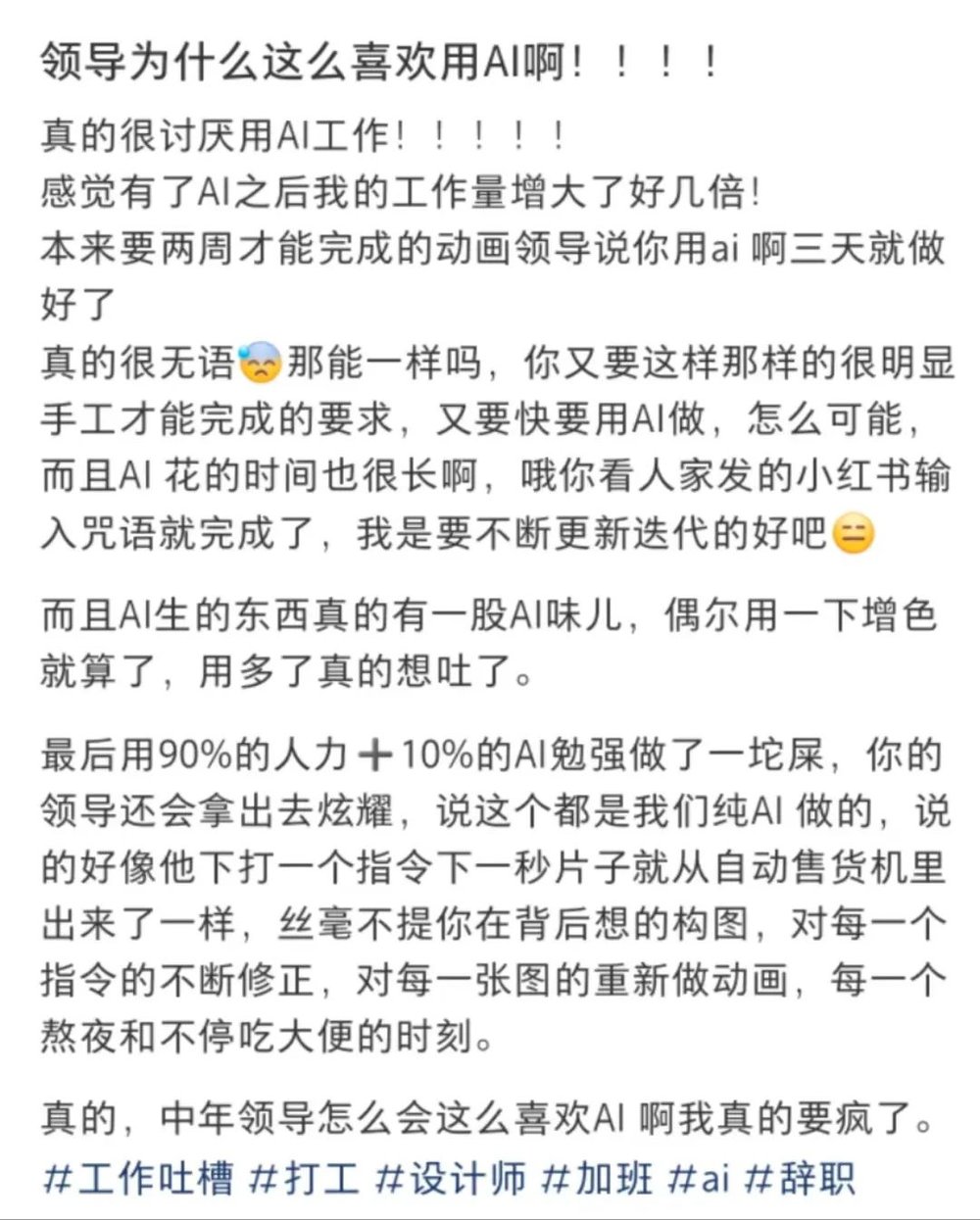 老哥的遭遇,并不是孤例。在小红书上,有不少打工人都有类似的抱怨——老板对AI产生了谜之崇拜,凡事都要问一句能不能用AI完成。