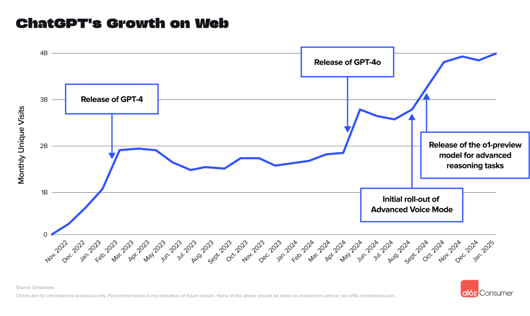 是什么推动了这一增长?最初的长期停滞源于 ChatGPT 的早期新奇因素;许多消费者觉得它很有趣,但缺乏引人注目的日常用例。